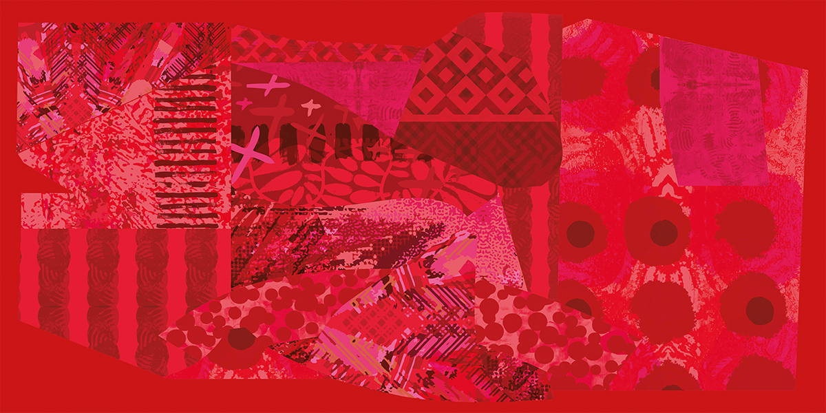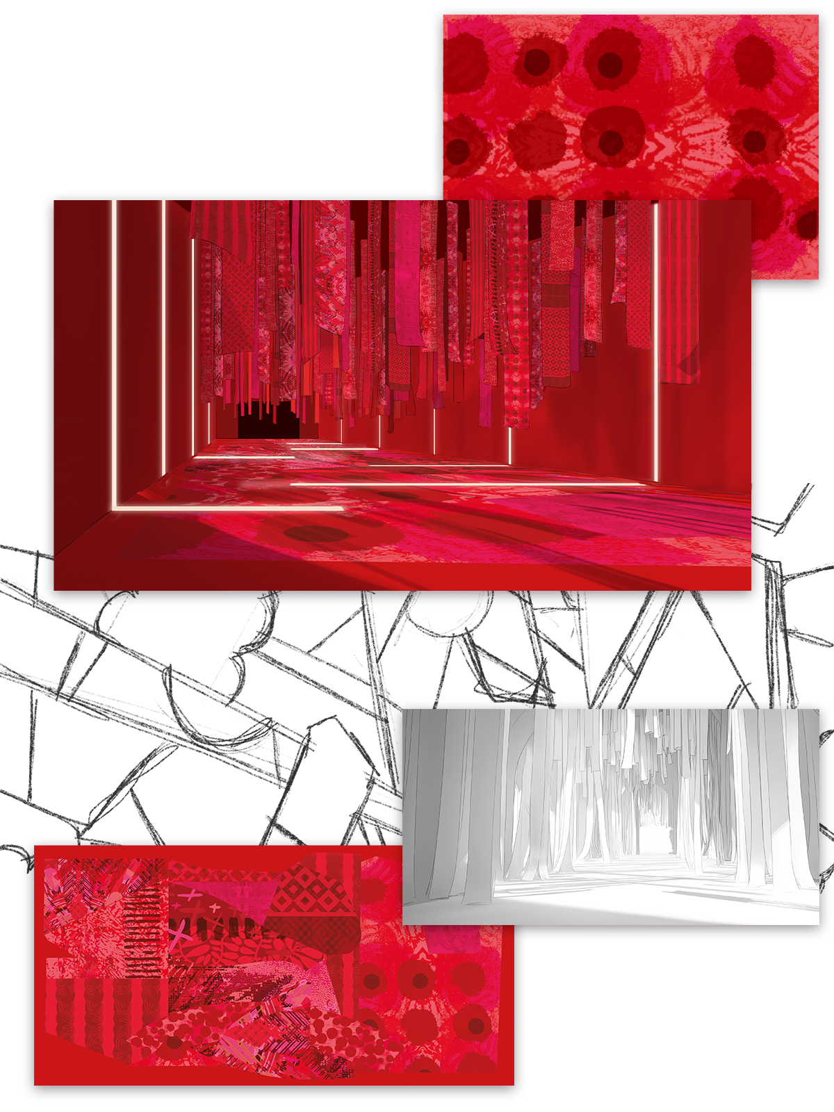 Le couloir, transformé en un écrin monochromatique, devient une expérience plastique du sensible. Les murs, le plafond, et les créations imprimées sur de longues bandes de papier verticales se fondent dans un continuum de nuances rouges.