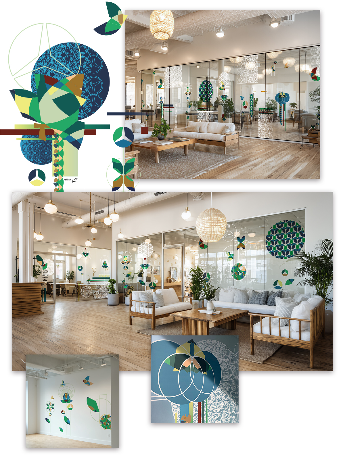 Lignes filaires, aplats colorés, superpositions délicates : le motif se transforme, se déploie, se cache parfois. Il traverse les espaces sans jamais se livrer entièrement, laissant au regard la liberté d’imaginer — un oiseau, une fleur, un battement d’aile.